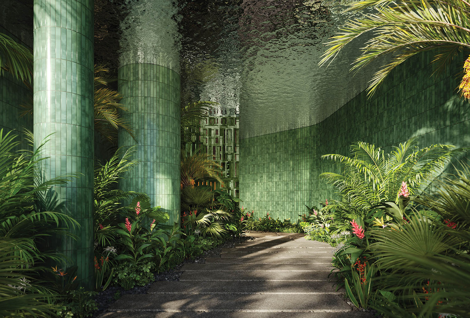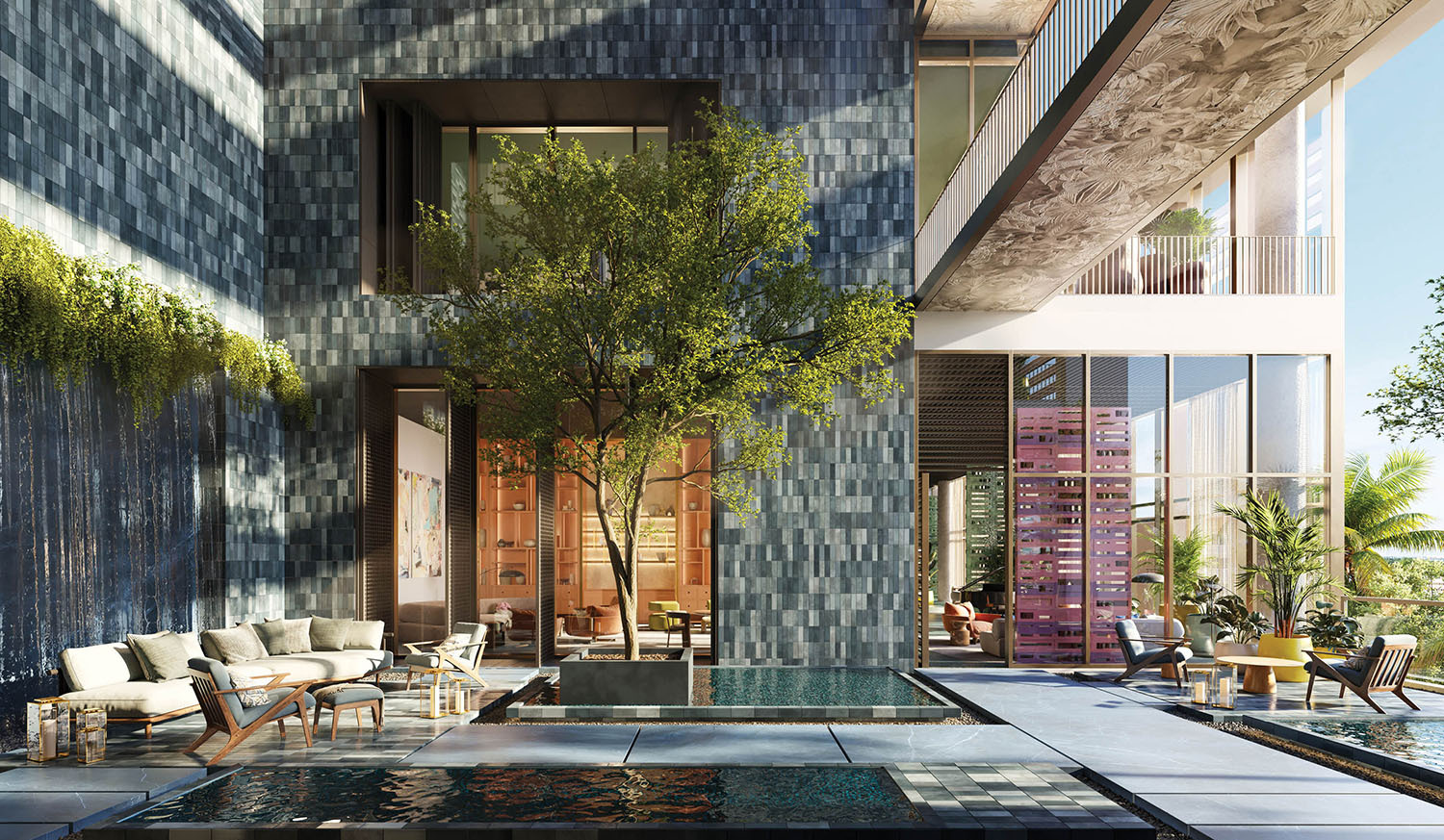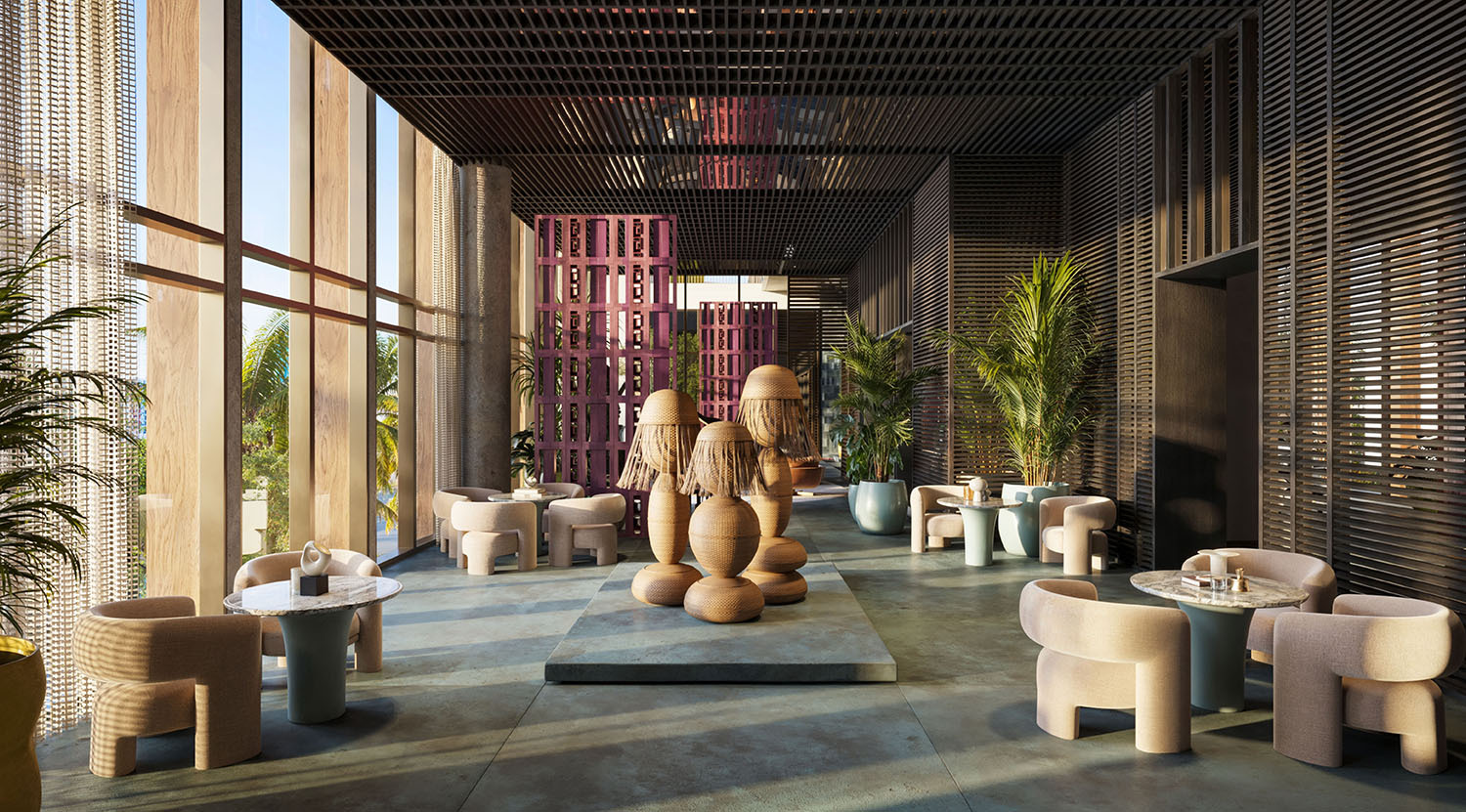 • Lobby and amenity levels by Yabu Pushelberg, immersed in CLAD-designed tropical landscaping and sculpture gardens.